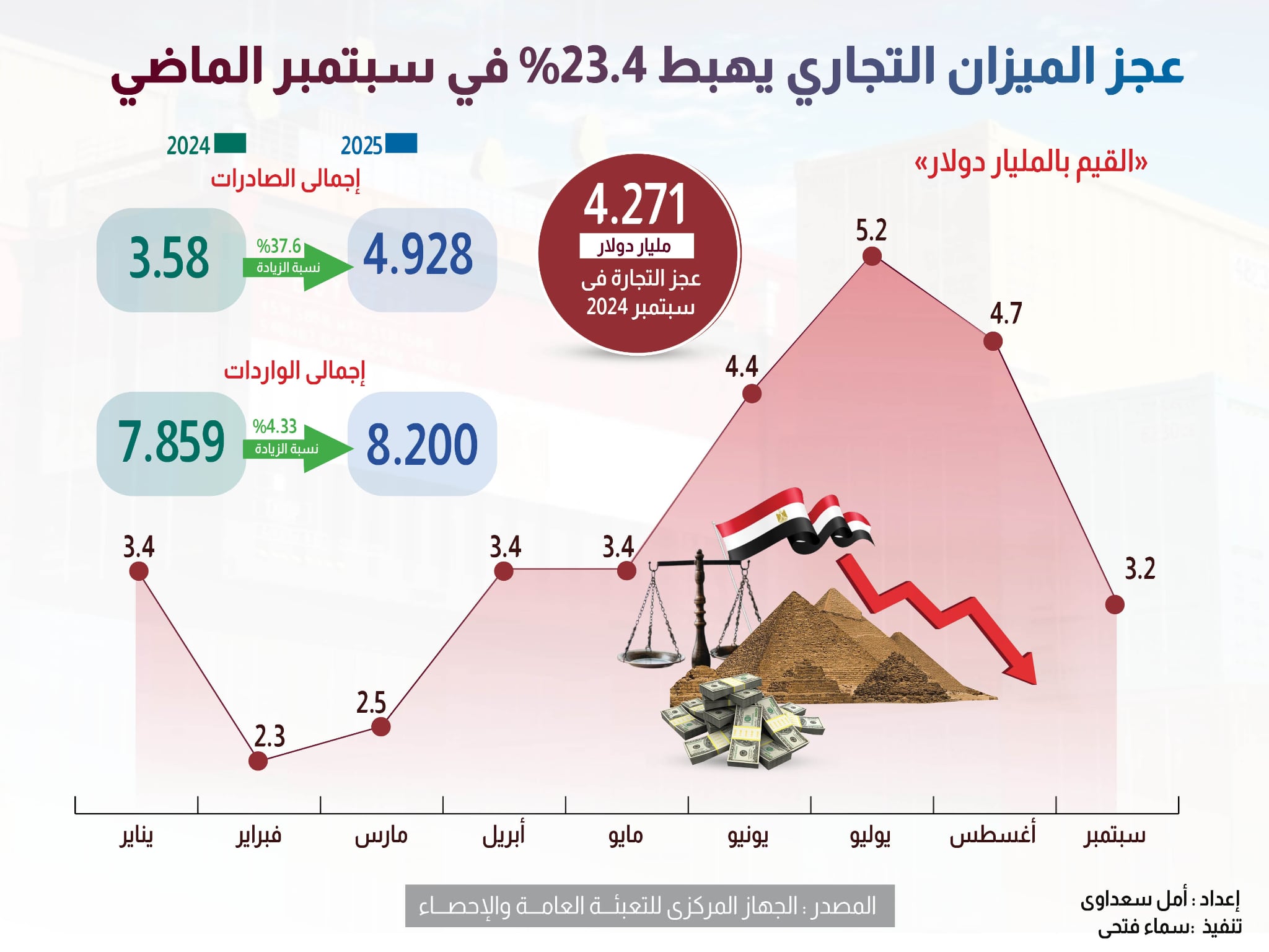 عجز الميزان التجاري المصري يهبط 23.4% في سبتمبر الماضي