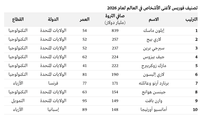 إيلون ماسك يتصدر قائمة فوربس لأغنى الأشخاص فى العالم لعام 2026
