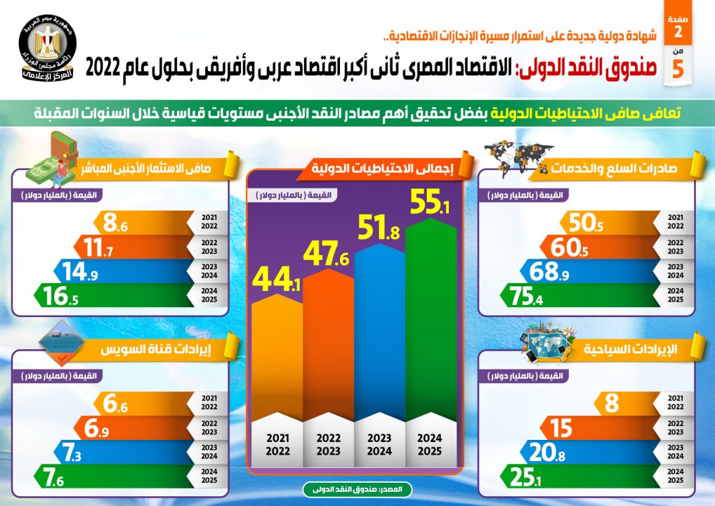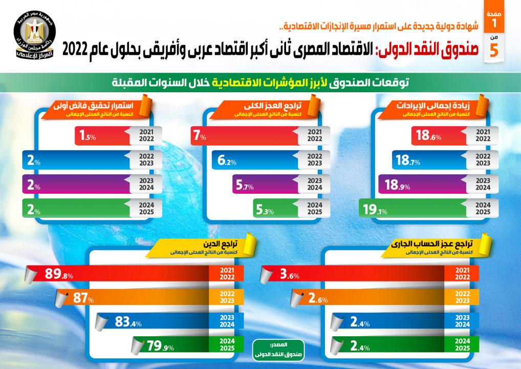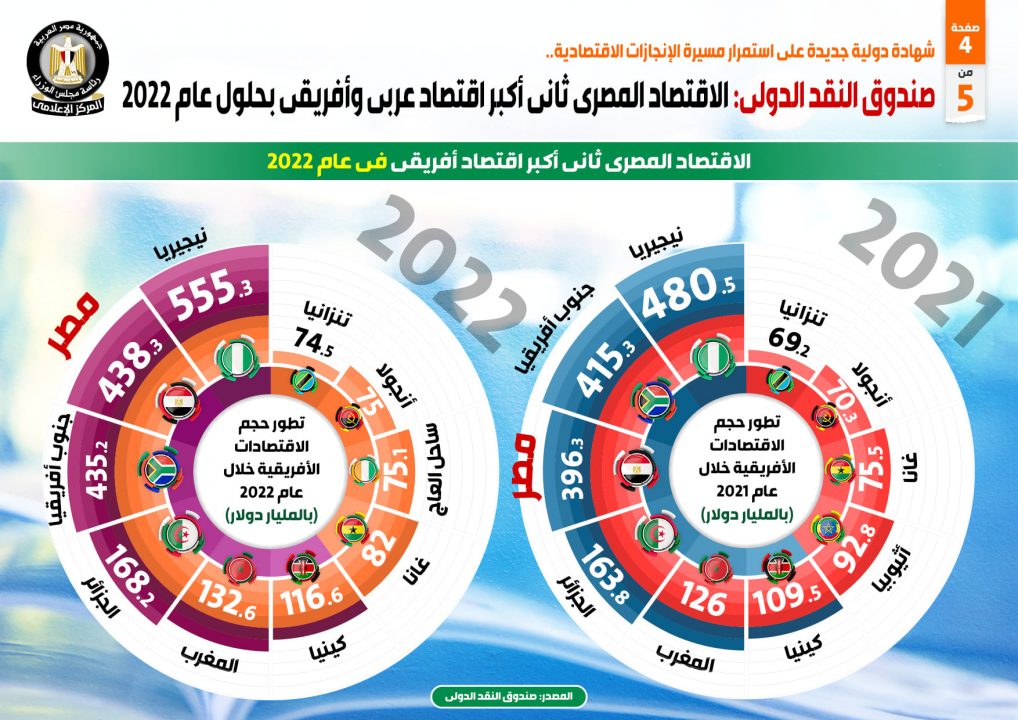 نشر المركز الإعلامي لمجلس الوزراء تقريراً تضمن إنفوجرافات تسلط الضوء على توقعات صندوق النقد الدولي بأن يصبح الاقتصاد المصري ثاني أكبر اقتصاد عربي وإفريقي خلال عام 2022، وذلك في شهادة دولية جديدة على استمرار مسيرة الإنجازات الاقتصادية.